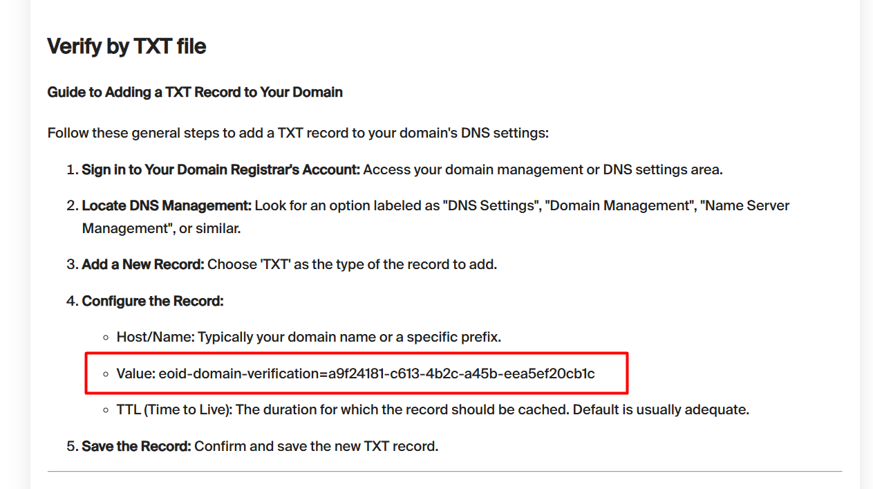 Når du har klikket på "Verify", vises TXT-posten du må legge til i DNS-konfigurasjonen.
